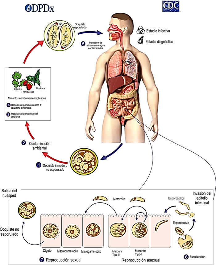 Cuando es expulsado el ooquiste en las heces no es infeccioso (1). En el medio ambiente (2) cuando tiene disponibilidad de oxígeno, la esporulación ocurre de una a dos semanas con temperatura entre 22°C y 32°C, lo que da como resultado la división del esporonte en dos esporoquistes, cada uno con dos esporozoítos alargados (3), es un proceso aeróbico. Los ooquistes esporulados pueden contaminar los alimentos frescos y el agua (4) que se ingieren (5). Los ooquistes al ser ingeridos por el humano se desenquistan en el tracto gastrointestinal, liberando los esporozoítos, que invaden las células epiteliales del intestino delgado (6). Dentro de las células se multiplican asexualmente en merontes tipo I que contienen de 8 a 12 merozoítos y merontes tipo II que contienen cuatro merozoítos. Los merozoítos de merontes de tipo I probablemente permanecen en el ciclo asexual, perpetuando la infección, mientras que los merozoítos de merontes de tipo II se desarrollan sexualmente en macrogametocitos y microgametocitos tras la invasión de otra célula huésped. Un microgametocito fertiliza a un macrogametocito, dando como resultado la formación de un cigoto que se convierte en un ooquiste, que se elimina en las heces (7) (CDC, 2019; Mathison & Pritt, 2021; Sarfo et al., 2022).