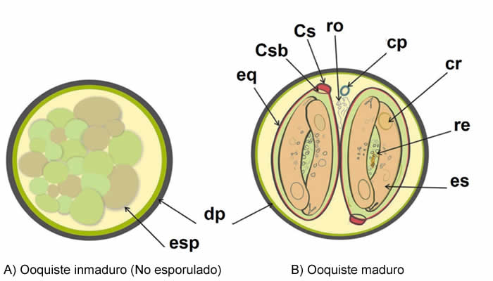 Los ooquistes completamente esporulados, contienen dos esporoquistes, cada uno con dos esporozoítos. Los esporoquistes son ovoides, ~4 × 6 µm, y contienen cuerpos de Stieda y substieda, y un gran residuo. Los cuerpos de Stieda son estructuras en forma de tapón involucradas en la exquistación de esporozoítos. Los esporozoitos son alargados, ~1 × 9 µm (Dubey et al., 2022), (Almeria et al., 2019), (Ynés R. Ortega & Sánchez, 2010), (Y. R. Ortega et al., 1994) (Figura 2 B).