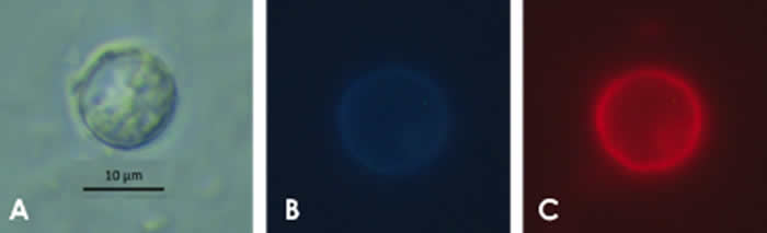 La fuerte autofluorescencia azul pálido de los ooquistes de Cyclospora cayetanensis cuando se observan por microscopía ultravioleta a 365 nm (Figura 3 B), o color verde (Figura 3 C) bajo excitación de 450–490 nm (García, Lynne Shore 2021), es una condición útil para su identificación, sobre todo cuando se analizan muestras como vegetales, frutas o agua, en donde pueden estar presentes otros coccidios.