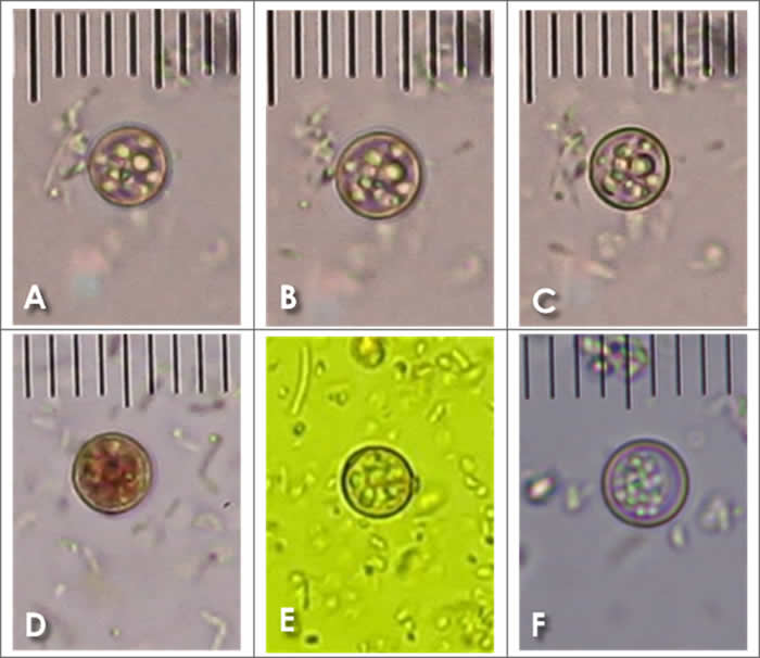 La tinción con soluciones de yodo Lugol al 1% con no más de dos semanas de preparación y que se ha mantenido a la oscuridad en frasco ámbar permite observar con más detalle la doble pared y los glóbulos de diferentes tamaños (Figuras 5 A, B y C). Cuando se usa yodo Lugol más concentrado puede dificultar la identificación (Figura 5 D). En muestras con biliverdina, los ooquistes se observan con detalle (Figura 5 E) sin necesidad de USAR algún colorante.