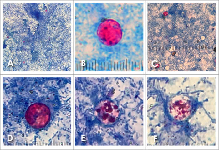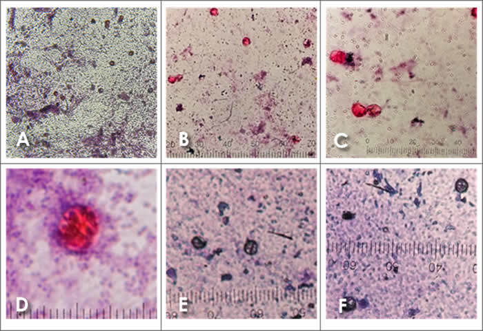La tinción con Giemsa también revela la presencia de estructuras de los ooquistes de Cyclospora cayetanensis, los cuales se observan un poco más teñidos que el campo que lo rodea, por lo que resaltan poco, por lo que no recomendamos su empleo, Figura 7 (E –F).