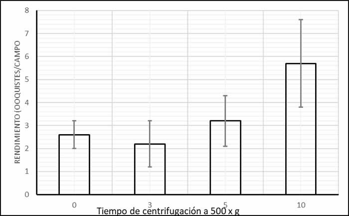 El empleo de la centrifugación por 10 minutos a 500 x g aumenta la probabilidad del hallazgo de los ooquistes (Figura 8), además a partir del sedimento se pueden realizar tinciones permanentes, por lo que es ampliamente necesario utilizar los métodos de concentración por flotación o por sedimentación, en especial en muestras de consistencia líquida y moco abundante.