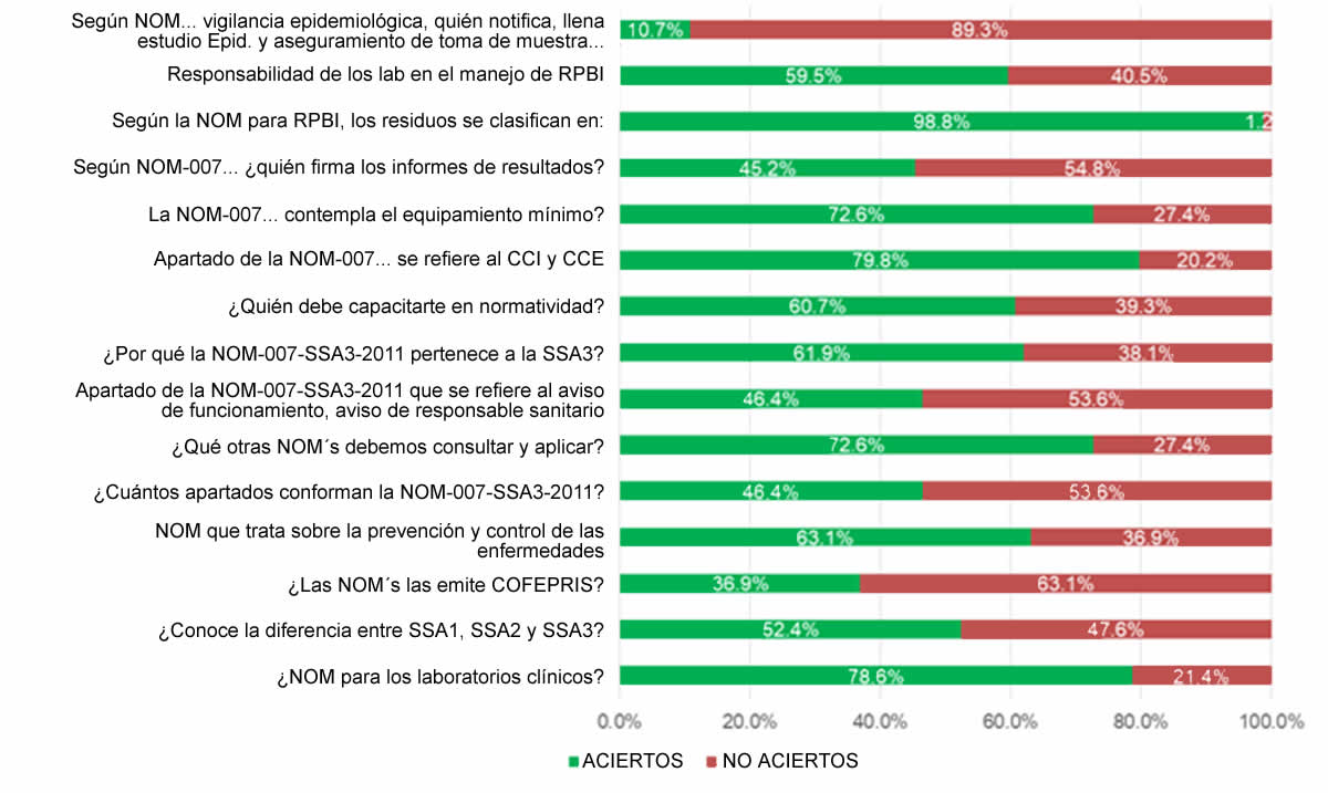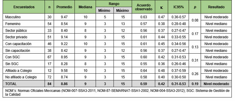 Es importante mencionar que en general existe un nivel moderado de conocimiento sobre normatividad en el grupo encuestado (k=0.42; IC95: 0.31–0.53) según Ladis y Koch (0.41-0.60), no existe significancia estadística entre los grupos analizados (p>0.05), no obstante, en el grupo femenino, establecimientos del sector público, aquellos que no han recibido capacitación sobre NOM´s en su lugar de trabajo, los que no tienen un SGC y los que no se encuentran afiliados a ningún colegio, resultaron con un nivel más bajo respecto a los otros grupos (nivel mediano 0.21-0.40), ya que un alto porcentaje desconoce información básica como las NOM´s que emite la COFEPRIS (SSA1), apartado de la NOM-007-SSA3-2012 que establece sobre el aviso de funcionamiento y responsable sanitario, quién debe firmar los resultados de los informes y, sobre todo, quién es responsable de notificar, llenar los estudios epidemiológicos y asegurar la toma de muestras según la NOM sobre vigilancia epidemiológica.