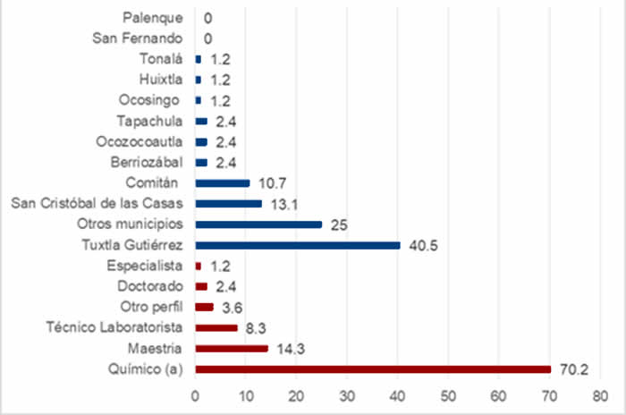 Tuxtla Gutiérrez fue el municipio con mayor participación con un 40.5%, Químicos con licenciatura resultó ser el perfil académico con más participación con 70.2%, seguido por Químicos con Maestría con 14.3% y técnicos laboratoristas con 8.3% (Gráfico 1).